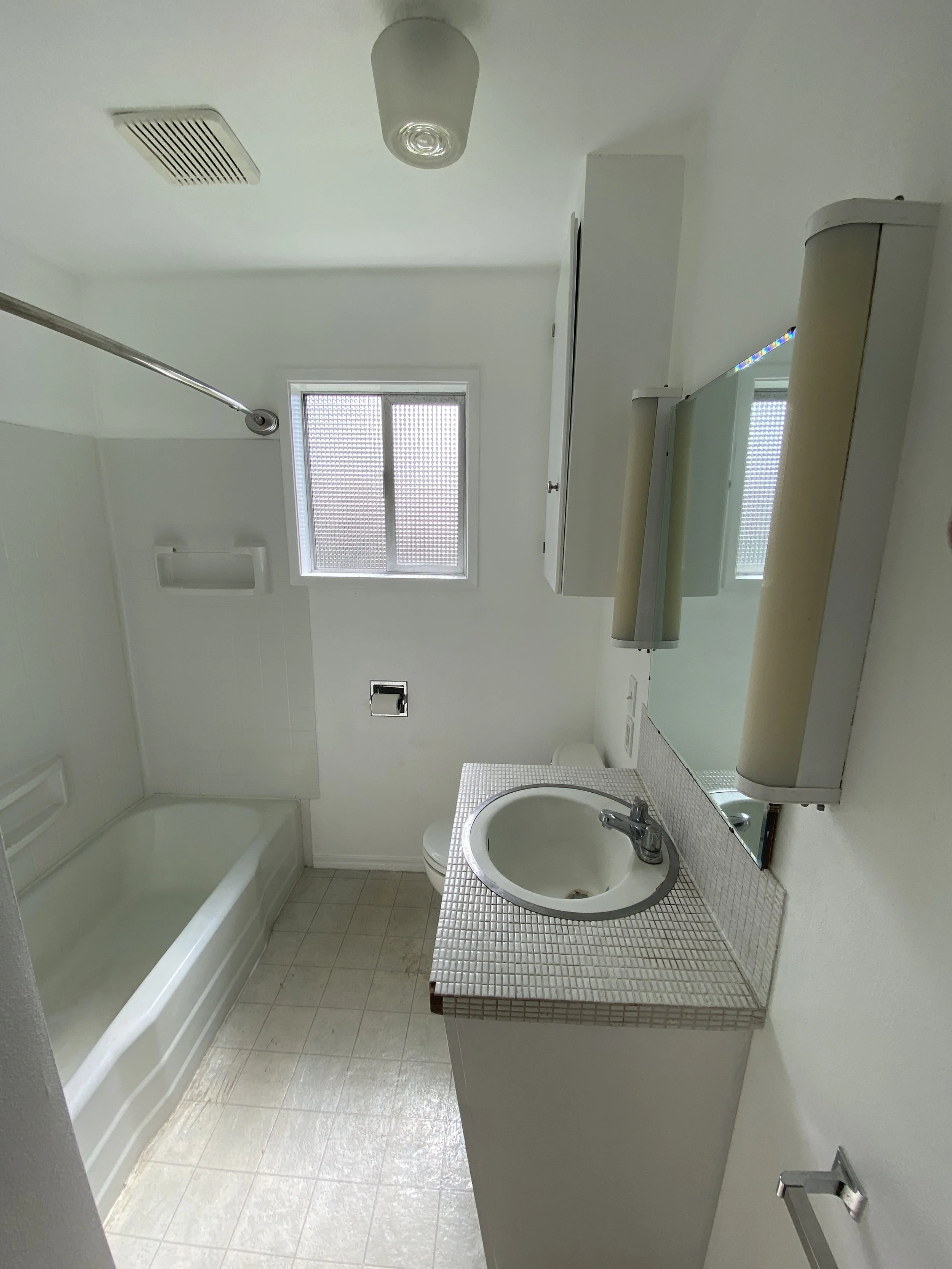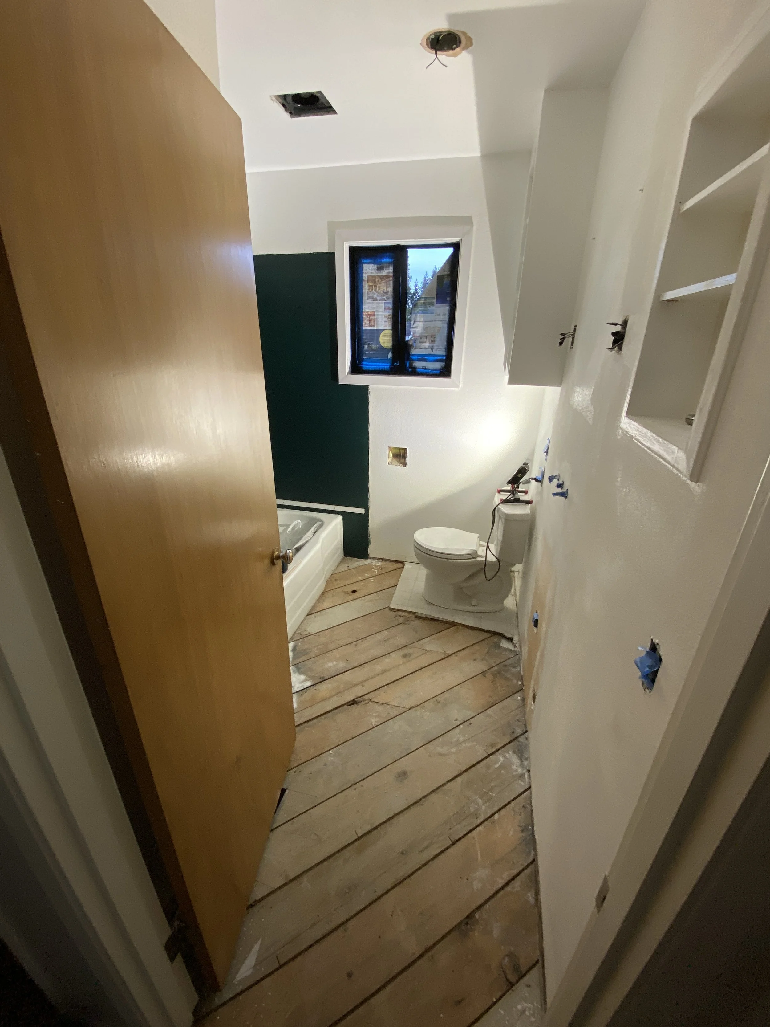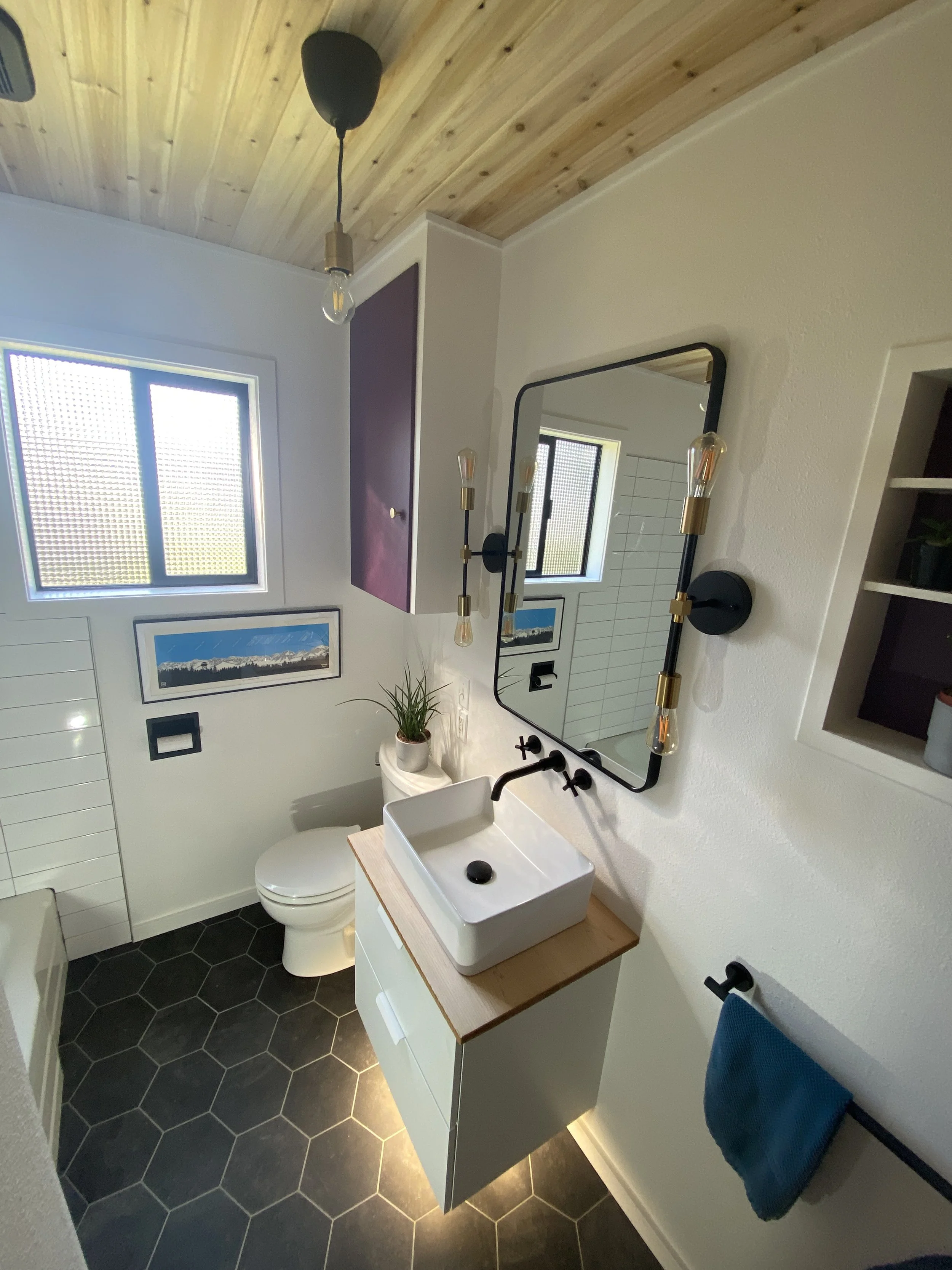 This bathroom remodel was a fun one! It involved removing the old shower surround, sink, vanity, mirror, lights and flooring, and then installing updated fixtures. Some of my favorite additions were the hexagon tiled flooring, tongue and groove cedar ceiling, floating vanity with under cabinet lighting, subway tiled shower, and new modern plumbing and electrical fixtures.